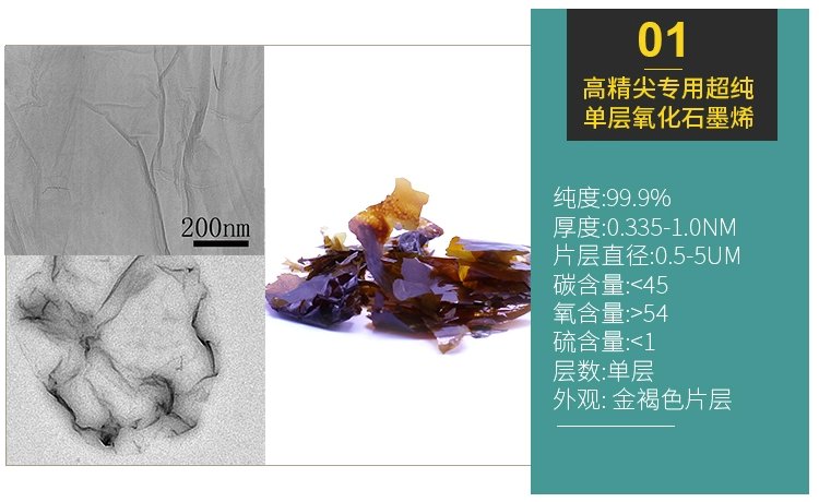 | 高精尖超纯单氧化石墨烯 | 金褐色片层 | 99.9% | 0.335-1.0nm | <45 | >54 | <1 | 0.5-5um | 单层 |