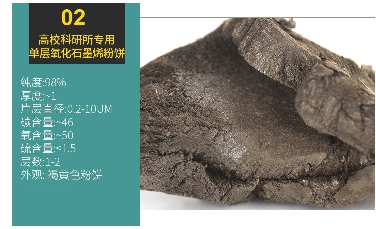 | 高校科研所专用单层氧化石墨烯粉饼 | 褐黄色粉饼 | 98% | ~1 | <46 | >50 | <1.5 | 0.2-10um | 1-2 |