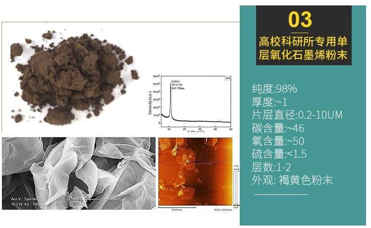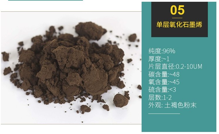 | 单层氧化石墨烯 | 土褐色粉末 | 96% | ~1 | <48 | >45 | <3 | 0.2-10um | 1-2 |