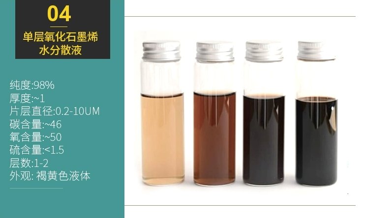 | 单层氧化石墨烯水分散液 | 褐黄色液体 | 98% | ~1 | <46 | >50 | <1.5 | 0.2-10um | 1-2 |